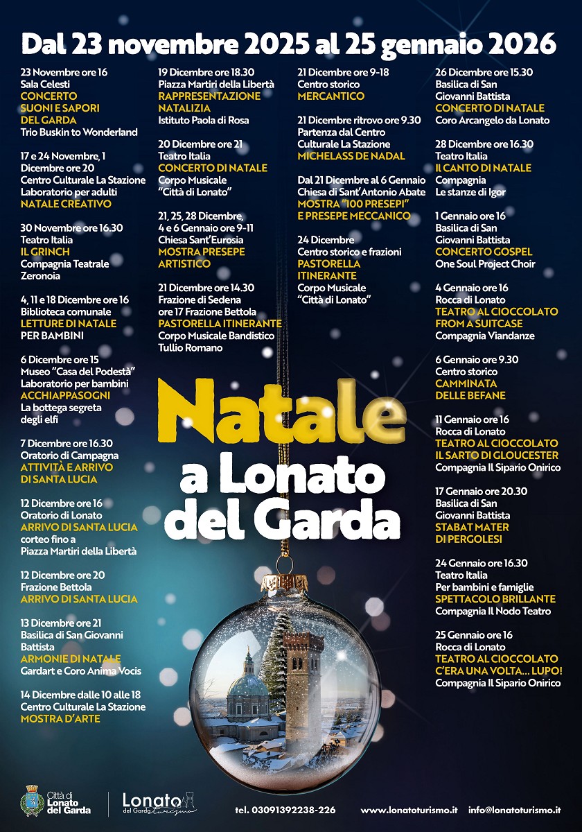 Iniziative per tutti, grandi e piccoli, tra musica, arte, teatro e iniziative legate alle tradizioni locali: il Natale a Lonato del Garda offre un ampio cartellone culturale che spazia dalla musica sacra e sinfonica agli spettacoli teatrali per famiglie, dalle mostre artistiche ai presepi tradizionali e meccanici.