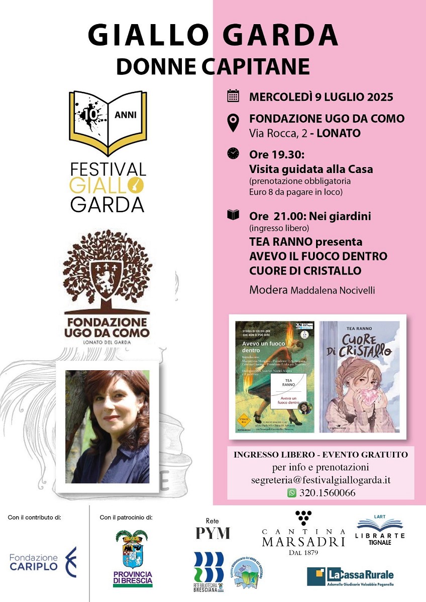 Giallo Garda – Donne Capitane Mercoledì 9 luglio 2025 Nei Giardini della Fondazione Ugo Da Como, Tea Ranno presenta i libri Avevo il fuoco dentro e Cuore di cristallo. Ore 19.30 visita guidata alla Casa (€8, su prenotazione) Ore 21.00 presentazione nei giardini (ingresso libero) Info: segreteria@festivalgiallogarda.it – 320 1560066