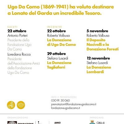 La Fondazione Ugo Da Como, con l’associazione di volontari Amici della Fondazione Ugo Da Como e il Patrocinio dell’Assessorato alla Cultura del Comune di Lonato del Garda organizza tra ottobre e novembre una serie di 4 incontri pubblici dedicati al “tesoro” custodito dall’Istituzione voluta dal Senatore bresciano.