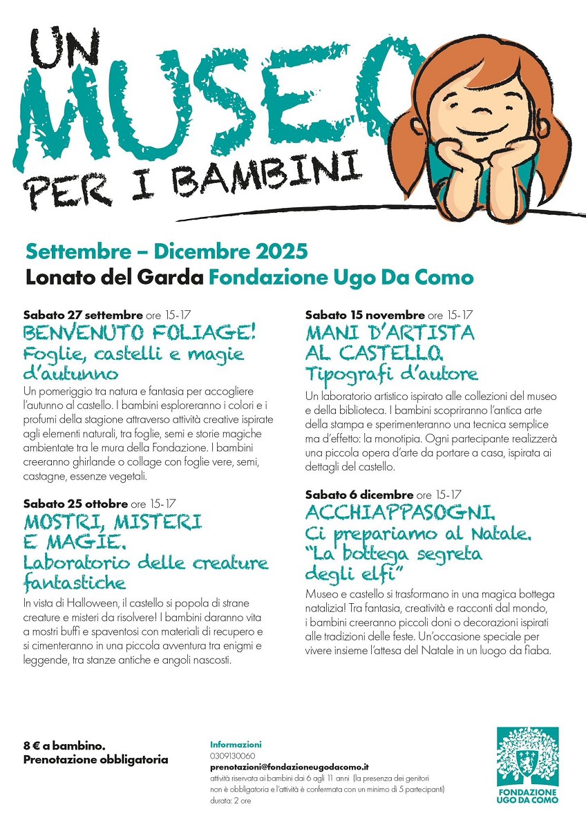 Un pomeriggio tra natura e fantasia per accogliere l'autunno al castello. I bambini esploreranno i colori e i profumi della stagione attraverso attività creative ispirate agli elementi naturali, tra foglie, semi e storie magiche ambientate tra le mura della Fondazione. I bambini creeranno ghirlande o collage con foglie vere, semi, castagne, essenze vegetali.